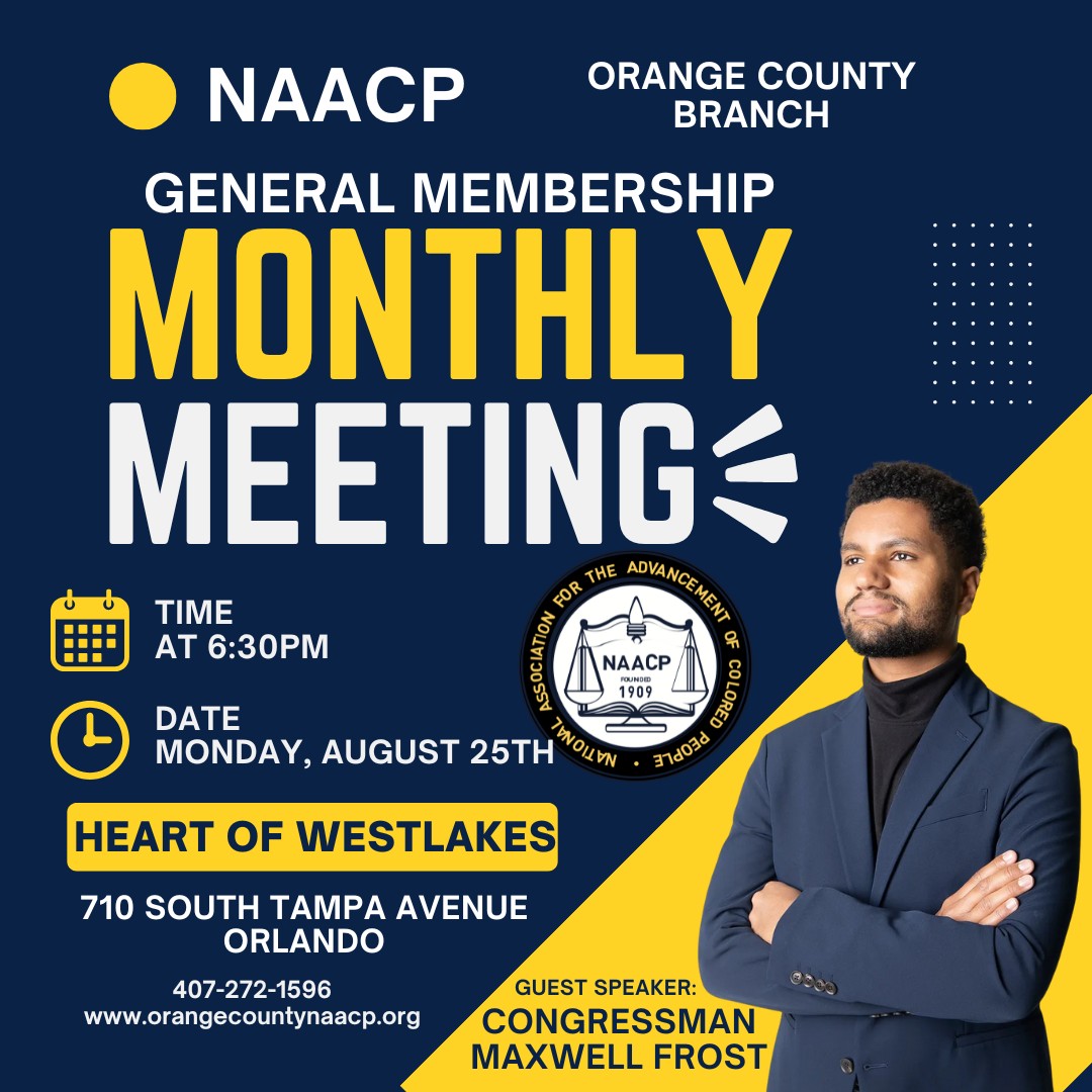 The NAACP Orange County Florida Branch #5120 will hold its monthly membership meeting at 6:30 p.m. on Monday, August 25th, 710 South Tampa Avenue, Orlando FL. Area, community and civil rights concerns and current Branch business and information will be presented. The NAACP membership meeting is regularly held at various locations throughout Orange County for the convenience and benefit of members in all local areas.